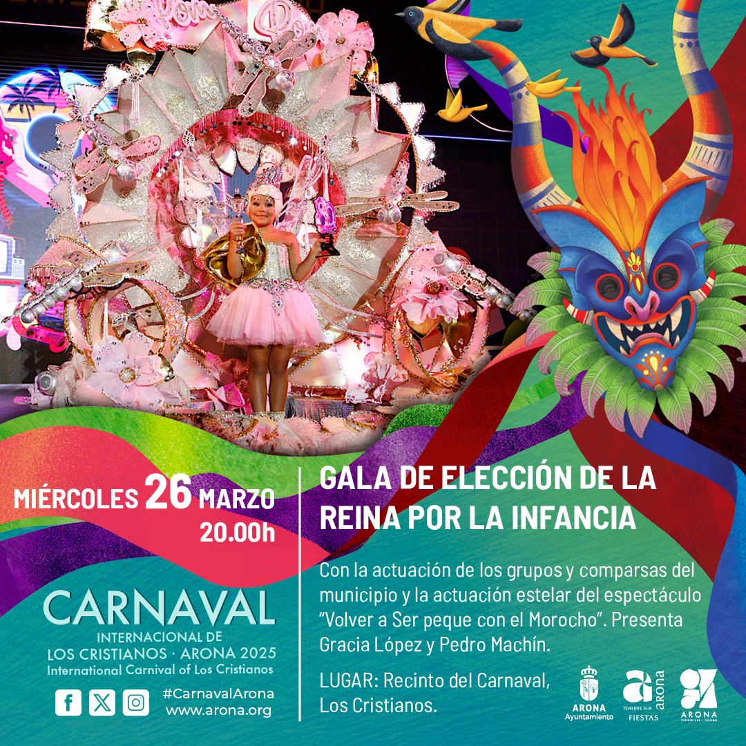 Gala de Elección de la Reina por la infancia del Carnaval. Con la actuación de los grupos y comparsas del municipio y la actuación estelar del espectáculo "Volver a Ser peque con el Morocho". Presente Gracia López y Pedro Machín.